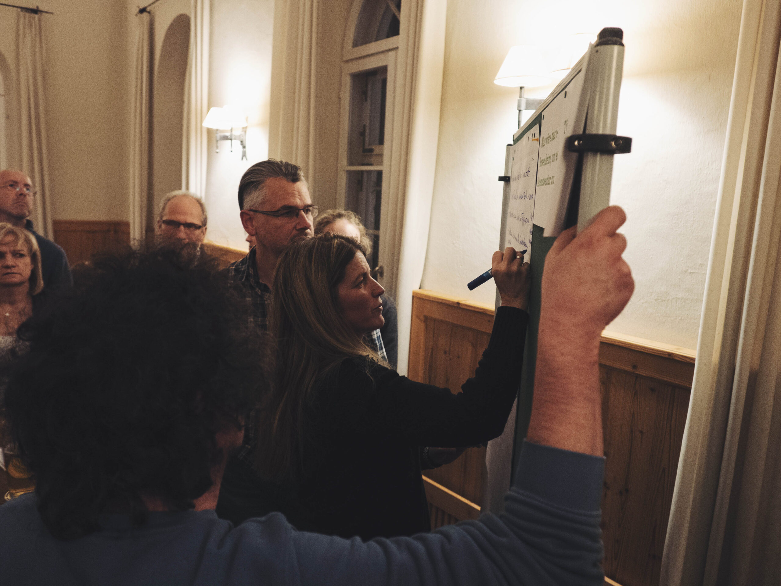 Mit diesem umfangreichen Input luden im Anschluss an den Impulsvortrag der Oberbürgermeisterkandidat Franz Opperer, die Listenplatz-Erste Anna Rutz sowie die Moderatorin des Abends Sonja Gintenreiter (Listenplatz 3) zum gemeinsamen Austausch, bei dem an unterschiedlichen Schautafeln verschiedene Fragen diskutiert wurden. Was gab es mal in Rosenheim, was du heute vermisst? Was macht Rosenheim für dich lebenswert? An vier großen Stellwänden hatten alle BesucherInnen im Anschluss Zeit, ihren Ideen freien Lauf zu lassen und diese mit anderen BürgerInnen zu diskutieren. Nach einer knappen Stunde wurden die umfassenden Ergebnisse von Franz Opperer und Anna Rutz aufgegriffen und in den konkreten Kontext der Kommunalwahl gestellt: ein klarer Auftrag an die beiden Kommunalpolitiker!